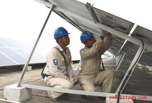 2014年9月16日,國網揚州市江都供電公司工作人員深入基層,來到“江蘇光伏賣電第一人”朱啟杰以及其他分布式光伏發(fā)電用戶,為他們解決光伏發(fā)電和并網中遇到的問題,促進江都分布式光伏發(fā)電產業(yè)的快速發(fā)展。目前,揚州市江都區(qū)有32家分布式光伏發(fā)電用戶申請并網,已經并網20家,其中企業(yè)為3家,個人為17家,并網總容量為310千瓦,在江蘇省各縣(市、區(qū))名列前茅。圖為江都供電公司員工為揚州永力電子公司120千瓦分布式光伏發(fā)電裝置檢修線路。