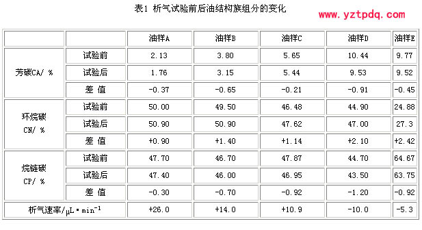 注: ① 油樣A、B、C均為環(huán)烷基油,油樣D為油樣A加濃縮芳烴而成;② 油樣E為石蠟基油加濃縮芳烴而成,析氣試驗(yàn)后,析氣池中有淡黃色蠟狀物。