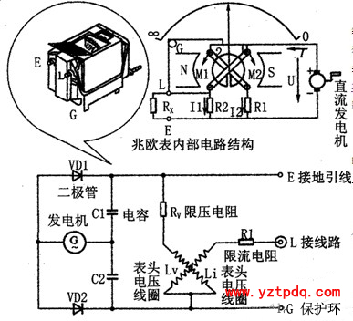 與搖表表針相連的有兩個線圈,一個同表內(nèi)的附加電阻R串聯(lián);另一個和被測電阻R串聯(lián),然后一起接到手搖發(fā)電機上。當(dāng)手搖動發(fā)電機時,兩個線圈中同時有電流通過,在兩個線圈上產(chǎn)生方向相反的轉(zhuǎn)矩,表針就隨著兩個轉(zhuǎn)矩的合成轉(zhuǎn)矩的大小而偏轉(zhuǎn)某一角度,這個偏轉(zhuǎn)角度決定于兩個電流的比值,附加電阻是不變的,所以電流值僅取決于待測電阻的大小。