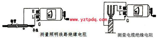 搖表(兆歐表)有三個測量端鈕,一個線路端鈕(L),另一個是接地端鈕(E),還有一個為屏蔽端鈕(G)。一般測量照片或電力線路對地的絕緣電阻時,只用L和E端,接線如下左圖所示。“L”端接到被測設(shè)備的“火”或“相端”,“E”端接到被測設(shè)備的“地”端。在測量電纜對地絕緣電阻時或被測設(shè)備的漏電流嚴重時,使用“G”端鈕。如下右圖所示為測量電纜絕緣電阻接線圖。