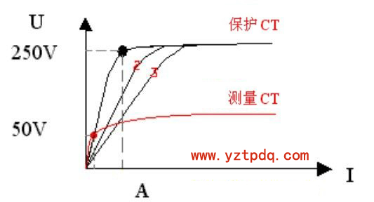 2、測(cè)得的伏安特性曲線與過(guò)去或出廠的伏安特性曲線比較,電壓不應(yīng)有顯著降低。若有顯著降低,應(yīng)檢查二次繞組是否存在匝間短路。當(dāng)有匝間短路時(shí),其曲線開(kāi)始部分電流較正常的略低,如圖中曲線 2、3 所示(指保護(hù) CT 有匝間短路,曲線 2 為短路 1 匝,曲線 3 為短路 2 匝),因此,在進(jìn)行測(cè)試時(shí),在開(kāi)始部分應(yīng)多測(cè)幾點(diǎn)。