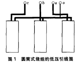 對于小型配電變壓器,例如500kVA及以下的產(chǎn)品,低壓為圓筒式繞組,y接線在繞組的上部(見圖1)。中性點(diǎn)引線很短,雖然設(shè)計(jì)規(guī)定引線設(shè)計(jì)按25%額定電流設(shè)計(jì),但在實(shí)際制造中,有的與其它引線相同,有的截面略小,因此中性點(diǎn)引線電阻所占比例不大,測線電阻、相電阻能滿足標(biāo)準(zhǔn)要求。