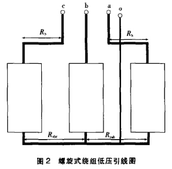 但對于630kVA及以上的配電變壓器,低壓多為螺旋式繞組,y接線在繞組的下部(如圖2所示)。中性點(diǎn)引線較長,按25%額定電流設(shè)計(jì)。這樣,中性點(diǎn)引線電阻隨著容量的增大,所占的比重越來越大。執(zhí)行JB/T501-1991時(shí),就會(huì)出現(xiàn)Rca>Rab=Rbc,這一規(guī)律完全是產(chǎn)品結(jié)構(gòu)造成的。