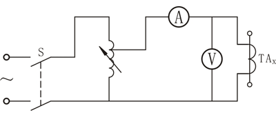 試驗接線如圖1-3所示。試驗前,應將電流互感器二次繞組引線和接地線均拆除,試驗時,一次測開路,從二次側施加電壓,為了讀數(shù)方便,可預先選取幾個電流點,逐點讀取相應電壓值。通入的電流或電壓以不超過制造廠技術條件的規(guī)定為準。當電流增大而電壓變化不大時,說明鐵芯已飽和,應停止試驗。試驗后,根據(jù)試驗數(shù)據(jù)繪出伏安特性曲線。