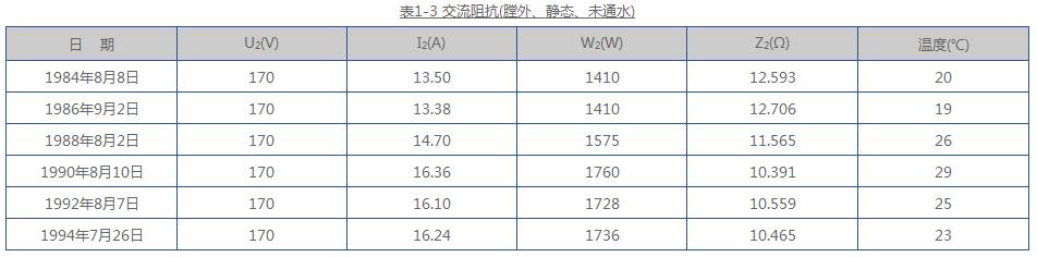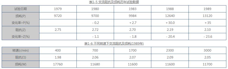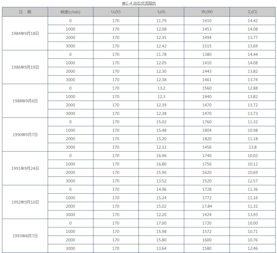 從表1-5及表1-6中可見,1979~1989年間,交流阻抗是逐年減少,而損耗卻逐年增加;在不同轉(zhuǎn)速下的交流阻抗隨轉(zhuǎn)速的變化不大,說明轉(zhuǎn)子繞組短路為穩(wěn)定性短路。