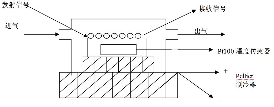 如圖1所示,氣體通過(guò)露點(diǎn)測(cè)量室時(shí)掠過(guò)露層傳感器。當(dāng)露層傳感器溫度高于該氣體的露點(diǎn)溫度時(shí),露層傳感器呈干燥狀態(tài),此時(shí),通過(guò)露層傳感器的發(fā)射信號(hào)和接收信號(hào),經(jīng)控制回路比較、放大,驅(qū)動(dòng)熱電制冷器(由一級(jí)或數(shù)級(jí)Peltier元件組成),對(duì)露層傳感器制冷;當(dāng)露層傳感器溫度降至樣氣的露點(diǎn)溫度以下時(shí),露層傳感器上開(kāi)始結(jié)露(或霜),這時(shí)接收器采集的信號(hào)產(chǎn)生變化,此變化經(jīng)控制回路比較、放大后調(diào)節(jié)熱電制冷器激勵(lì),使其制冷功率減小,zui后,露層傳感器溫度保持在樣氣的露點(diǎn)溫度上。