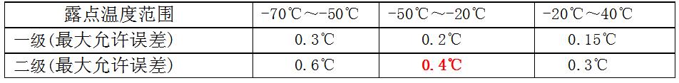 精密露點(diǎn)儀的示值誤差為儀器測(cè)量的平均值Td 與計(jì)量檢定值Td’之差,精密露點(diǎn)儀在露點(diǎn)溫度-70℃~+40℃之間的zui大允許誤差應(yīng)符合表1中的技術(shù)要求。