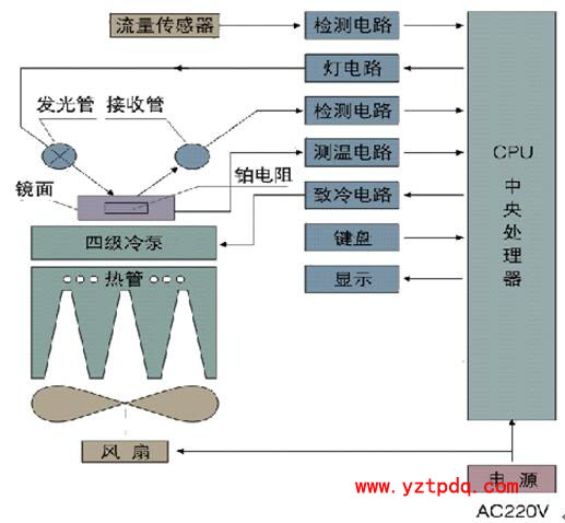 2)制冷控制部分:由鏡面、冷堆、基座、熱管散熱器和風(fēng)扇組成,鏡面嵌在冷堆的冷面,冷堆嵌在基座內(nèi),通過散熱器散熱并由風(fēng)扇冷卻。制冷能力強(qiáng),效率高。
