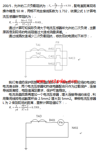 最好的解決辦法是不增大電纜截面積的情況下,應(yīng)該優(yōu)先選用200/1的電流互感器,同樣5VA的容量下允許的二次負荷為5Ω,原來的2.5mm2電纜足夠滿足要求,不會增加很多成本,同時滿足更遠距離的測量要求。