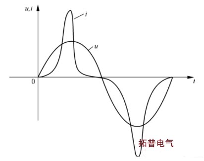 空載時(shí),電流很小,鐵芯處于非線性區(qū),電流發(fā)生畸變,其波形比普通的正弦波要“尖”,通常稱(chēng)為“尖頂波”。電流增大后,這種現(xiàn)象會(huì)隨之消失,當(dāng)電流過(guò)大時(shí),會(huì)進(jìn)入另一端非線性區(qū)域,電流又會(huì)發(fā)生畸變。