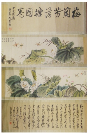 在馬維衡家中,他拿出了這幅珍貴的梅蘭芳手卷。展開一看,手卷長近4米,盡管年代久遠(yuǎn),但因主人保管得當(dāng),畫面上的顏色還是青翠欲滴。整幅畫卷看上去清新淡雅,荷花荷葉錯落有致。畫卷原本略長,但是在中間部位,點(diǎn)綴起幾只動態(tài)的蜻蜓,立刻就盤活了整幅畫卷,生機(jī)盎然起來。特別是梅蘭芳在綠色荷葉上的處理,更是濃淡皆宜,水墨洇染,顯示了深厚的中國水墨畫功底。在長卷的首尾處,都有當(dāng)代書法大家徐利明所題字,他也盛贊這幅畫作“皆入專家法門,無稍遜也。”