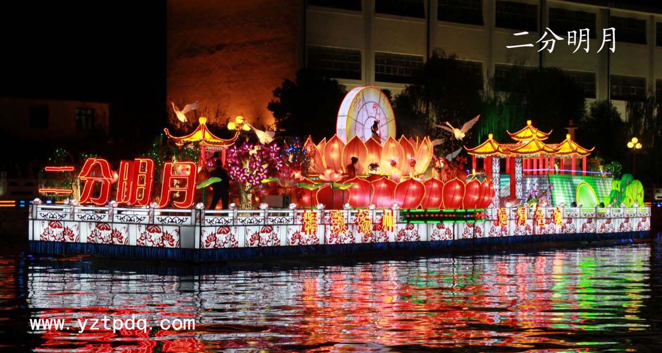 由蜀岡—瘦西湖風(fēng)景名勝區(qū)制作的領(lǐng)航花船“二分明月”號(hào)。該花船以國(guó)家5A級(jí)風(fēng)景區(qū)蜀崗—瘦西湖為藍(lán)本建構(gòu)。風(fēng)姿卓越獨(dú)樹一幟的五亭橋,寓意著幸福年年,代表著人類的智慧與巧思?;始艺洳匾撇綋Q景的白塔,見(jiàn)證著鹽運(yùn)的發(fā)達(dá),代表著至高的榮耀與尊寵。亭臺(tái)軒榭、層巒疊嶂、青山掩翠、桃紅柳綠,好一個(gè)荷塘月色,人間仙境。