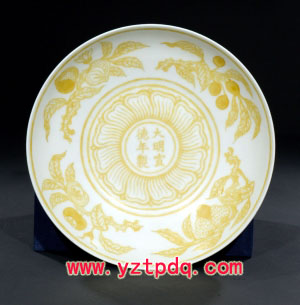 通體以釉上黃彩裝飾,內(nèi)外壁分別飾四組折枝瓜果紋和纏枝蓮紋,盤心印有黃彩“大明宣德年制”楷書款,周邊被一圈花瓣裝飾。這件明宣德黃彩花卉紋盤,世界上僅存兩件,其中一件陳列在大英博物館內(nèi)。“這件作品珍貴之處在于它的工藝制作,黃釉極難上色,因此它只能用剪紙貼在兩壁,再細細勾勒。”上海天物館館長錢偉鵬介紹。