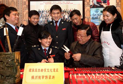 揚(yáng)州毛筆純手工制作,取材天然,工藝復(fù)雜。其工序有“均、齊、理、扎、裝、擇”等120余道,為機(jī)械模具無(wú)法替代,全憑手感、舌感和目測(cè),具有極高的工藝價(jià)值。成品筆具有“尖、齊、圓、健”四大特點(diǎn)。其品種繁多,分國(guó)畫筆、書法筆及高、中、低檔等五大類1600多個(gè)品種。