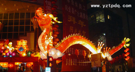 “鬧花燈”在揚州歷史悠久,清代惺庵居士的《望江南百調(diào)》記載:“揚州好,燈節(jié)慶元宵,絳蠟滿堂家宴集,金龍逐隊市聲囂,花鼓又高蹺”。家家戶戶張燈結(jié)彩,人們從事猜燈謎、歌舞等活動,不亦樂乎,元宵晚間常有四鄉(xiāng)的“舞龍”燈隊,或進(jìn)城鎮(zhèn)參加“燈會”比藝,或至各村莊巡回表演,也有耍獅子燈和馬燈、蕩湖船、打花鼓、踩高蹺,跳“河歪(河蚌)精”、跳“小人高肩”舞等見于燈隊中,沿途若有人燃放鞭炮表示歡迎,則必演上一段,熱烈氣氛常至深夜!