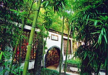 個(gè)園是一處典型的私家住宅園林。從住宅進(jìn)入園林,首先映入眼簾的是月洞形園門。門上石額書寫“個(gè)園”二字,“個(gè)”者,竹葉之形,主人名“至筠”,“筠”亦借指竹,以為名“個(gè)園”,點(diǎn)明主題。園門兩側(cè)各種竹子枝葉扶疏,“月映竹成千個(gè)字”,與門額相輝映;白果峰穿插其間,如一根根茁壯的春筍。主人以春景作為游園的開篇,想是有“一年之計(jì)在于春”的含意吧!透過(guò)春景后的園門和兩旁典雅的一排漏窗,又可瞥見園內(nèi)景色,樓臺(tái)、花樹映現(xiàn)其間,引人入勝。進(jìn)入園門向西拐,是與春景相接的一大片竹林。竹林茂密、幽深,與那幾顆瓊花展現(xiàn)出了生機(jī)勃勃的春天景象。