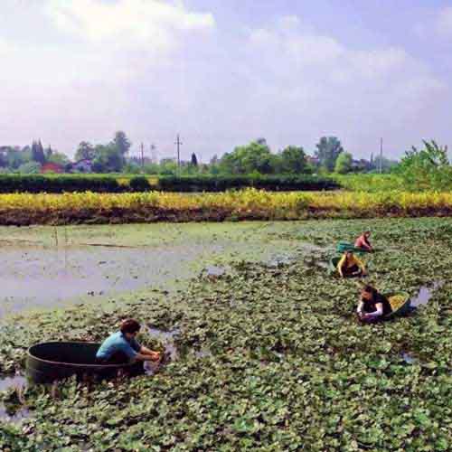 每當(dāng)秋季,邵伯鎮(zhèn)大小湖塘的水面上,全是碧綠一片,只見“叢叢菱葉隨波起,朵朵菱花背日開”,像是鋪了一層翡翠,密密匝匝,簇簇?fù)頁怼2闪馀碓谀九柚?,紅衣綠葉,暖風(fēng)美喉,如在畫中游動。只見,遠(yuǎn)處,碧波一湯漾,飛蜓野荷;岸上,壟田阡陌,煙村疏林;近旁,青菱白花,搖曵生姿,構(gòu)成了一幅秋日特有的旖旎圖畫,成了邵伯一道亮麗的風(fēng)景線。